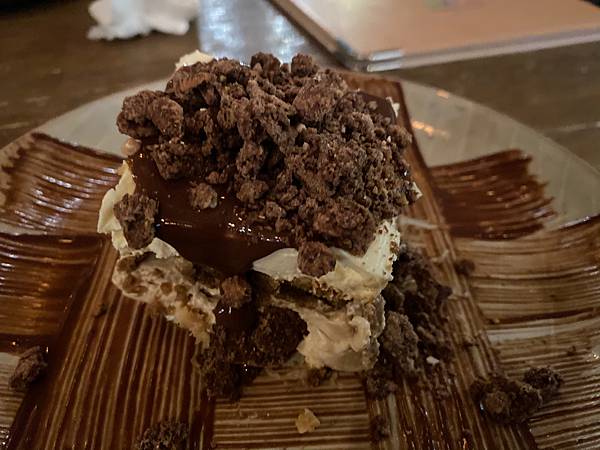 底盤刷上巧克力醬,濃密的奶油和酒香蛋糕體,超濃的,要配咖啡。 可是會胃食道逆流,也是滿二難的選擇。